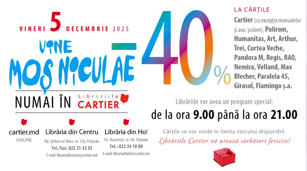 Vineri, 5 decembrie crt, în ajun de Moș Niculae, toate cărțile editurilor românești (Humanitas, Cartier, Art, Polirom, Curtea Veche, Sadoveanu, Epica, Aramis, Polisalm, Trei, Arthur, Girasol, Casa de Pariuri Literare, Junimea, Cartea românească, Flamingo, Cartex, Pandora M, Trei, RAO, Max Blecher, Paralela 45, Steaua Nordului) se vor vinde cu 60 la sută din preț în Librăriile Cartier din Chișinău (Librăria din Centru, bdul Ștefan cel Mare nr.126 și Librăria din Hol, str.București nr.68).